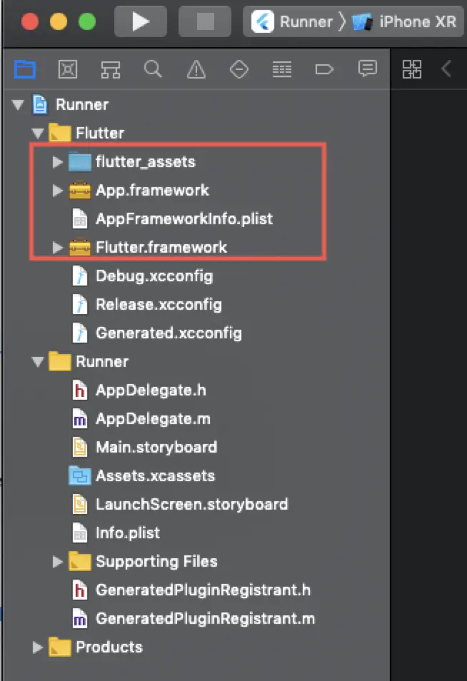 从 Flutter 的官网教程 中可以看到,它支持 flutter run 命令或者从 IDE 启动 iOS 工程。其实只要观察一下 ios 目录下的 Runner.xcworkspace 工程就会发现,Flutter 项目运行的就是这个工程。当然如果直接把我们的 iOS 工程拷贝过来是无法运行的。