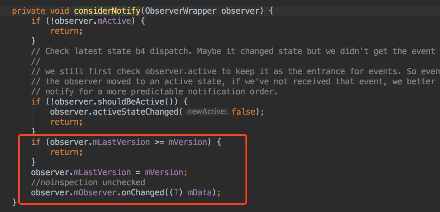 在LiveData的considerNotify方法中,红框中的逻辑是关键,如果ObserverWrapper的mLastVersion小于LiveData的mVersion,就会去回调mObserver的onChanged方法。而每个新的订阅者,其version都是-1,LiveData一旦设置过其version是大于-1的(每次LiveData设置值都会使其version加1),这样就会导致LiveDataBus每注册一个新的订阅者,这个订阅者立刻会收到一个回调,即使这个设置的动作发生在订阅之前。