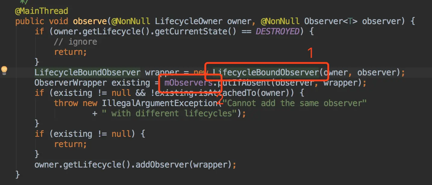 那么怎么实现呢,看看LiveData的observe方法,他会在步骤1创建一个LifecycleBoundObserver,LifecycleBoundObserver是ObserverWrapper的派生类。然后会在步骤2把这个LifecycleBoundObserver放入一个私有Map容器mObservers中。无论ObserverWrapper还是LifecycleBoundObserver都是私有的或者包可见的,所以无法通过继承的方式更改LifecycleBoundObserver的version。