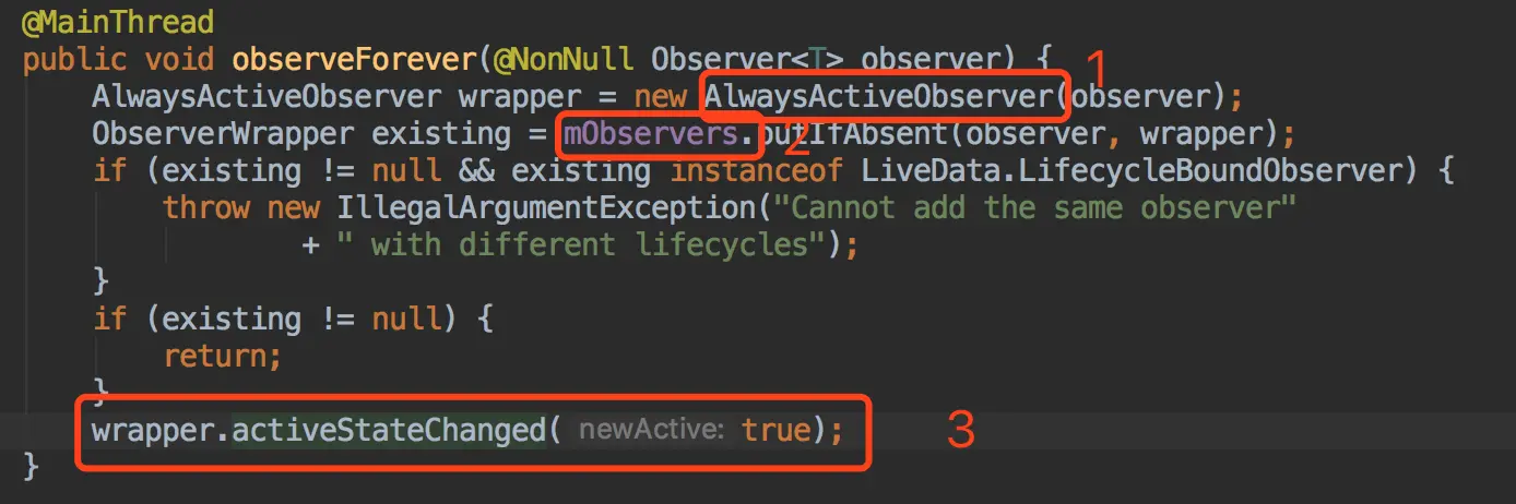 对于非生命周期感知的observeForever方法来说,实现的思路是一致的,但是具体的实现略有不同。observeForever的时候,生成的wrapper不是LifecycleBoundObserver,而是AlwaysActiveObserver(步骤1),而且我们也没有机会在observeForever调用完成之后再去更改AlwaysActiveObserver的version,因为在observeForever方法体内,步骤3的语句,回调就发生了。