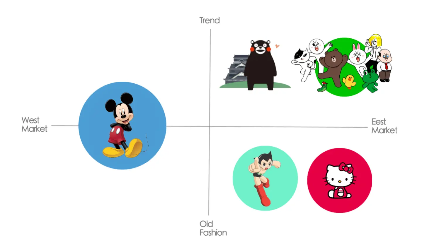 2.亲和力,这是小卡通们安身立命的东西。跟相亲一样,这个领域尤其的外貌协会,就好像米老鼠、阿童木的聪明机灵;Hello kitty、泰迪熊的乖巧可人;熊本熊、Line friends的小贱呆萌,在造型和气质上先抓得住用户爸爸的眼球,他们才愿意进一步去了解与你有关的事物。