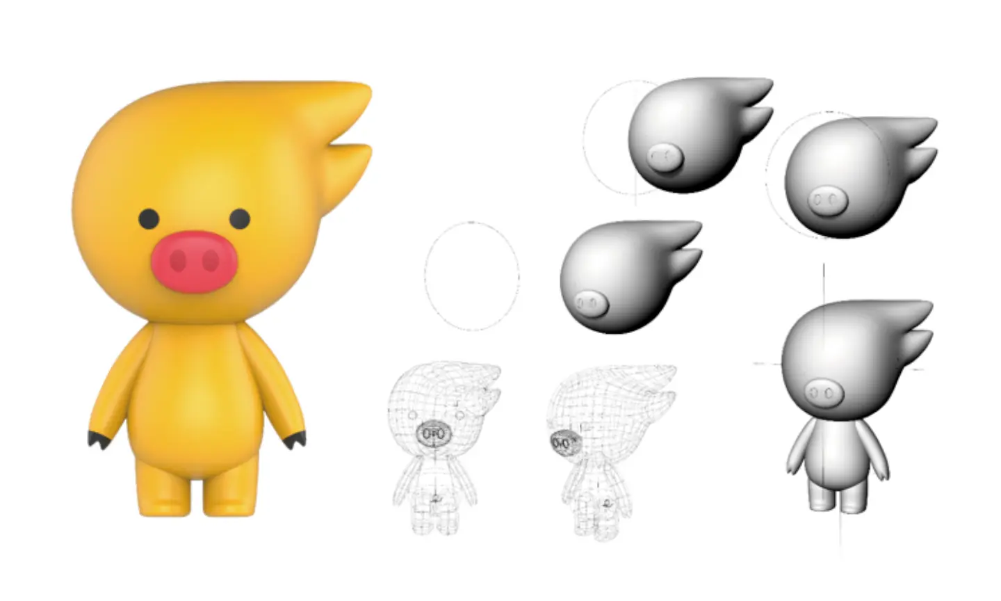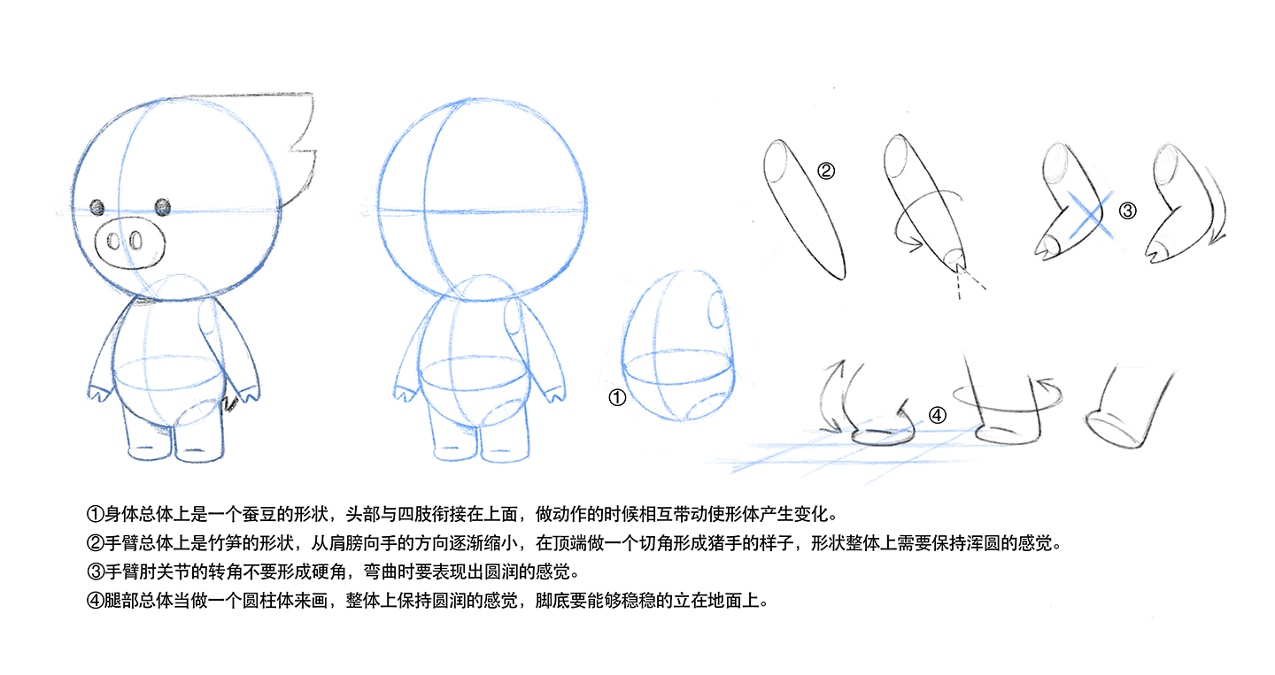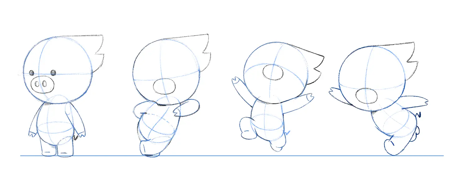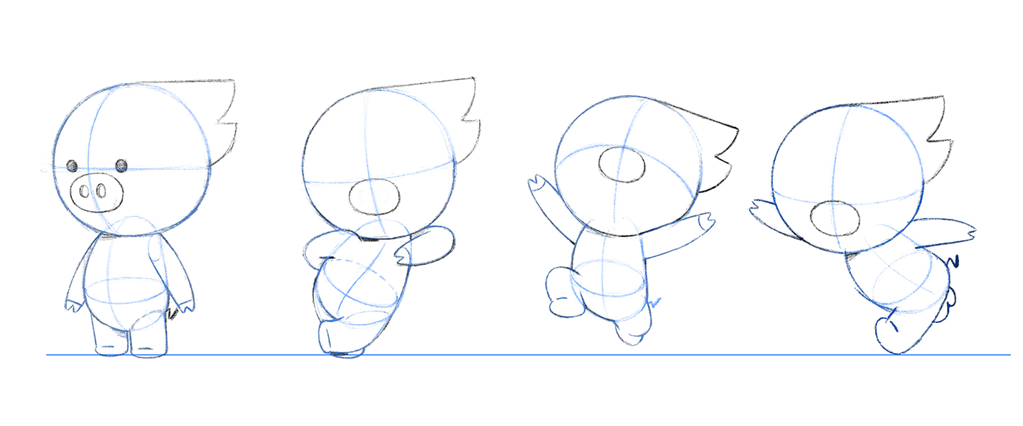 这部分主要解决的是形象“表演性”的问题,要让小飞猪的肢体语言有好的表现力,我们首先需要对他的造型进行一次结构化的拆分,在明确了肢体的形状和比例之后,在形象后续的动作延展上才能做到有据可循。