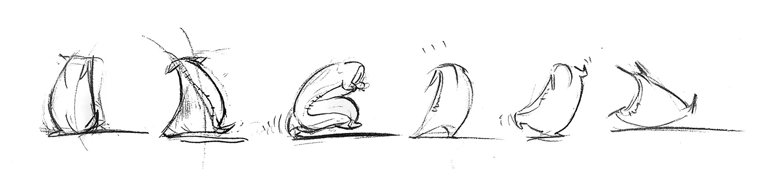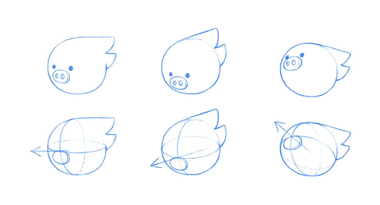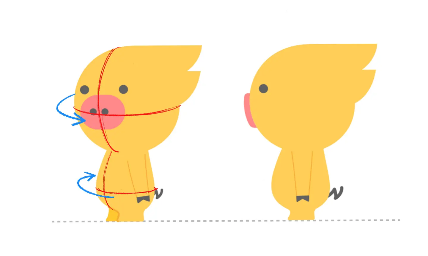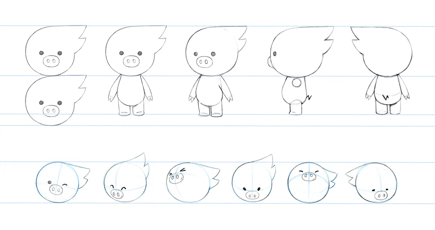 这部分主要解决的是形象“表演性”的问题,要让小飞猪的肢体语言有好的表现力,我们首先需要对他的造型进行一次结构化的拆分,在明确了肢体的形状和比例之后,在形象后续的动作延展上才能做到有据可循。