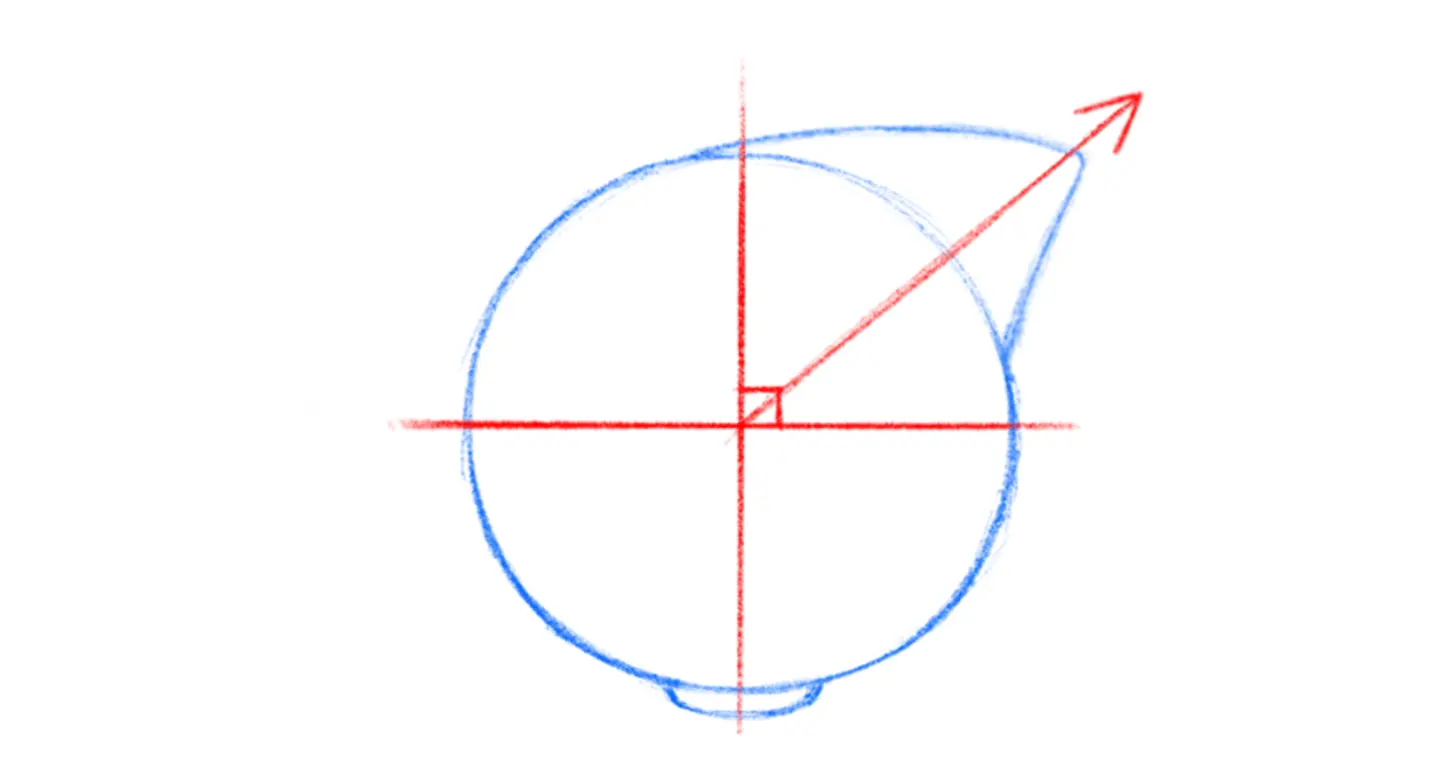 在图形化的状态下,头发的角度是与logo同样保持向右的,但是作为一个立体的卡通形象来考量,我们可以想象一下如果一个人的发型是完全朝向自己头部的正侧面看上去一定是很奇怪的(可能有点谢顶),至少我们不会把这种造型跟亲和力联系起来。所以,我们将飞猪的头发设计成朝向左后方的45度,同时把这部分的形状与头部球体的切线以弧线衔接起来,做成一个自然的整体,通过这种方式在卡通形象的身上表现出飞猪logo的主要特征。