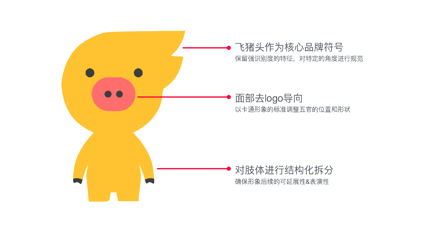 经过前面主要的问题整理和案例分析,小飞猪的调整方向似乎也出来了:我们将飞猪头的轮廓作为品牌核心符号进行强化,在此基础上对五官的搭配和形体设计综合考量平面与3D的呈现效果进行调整。