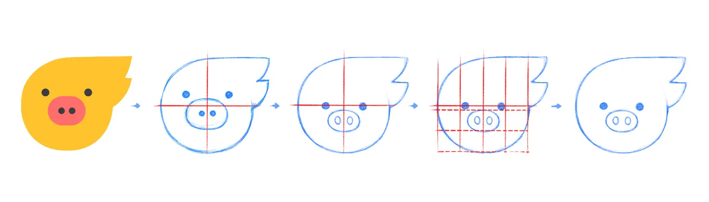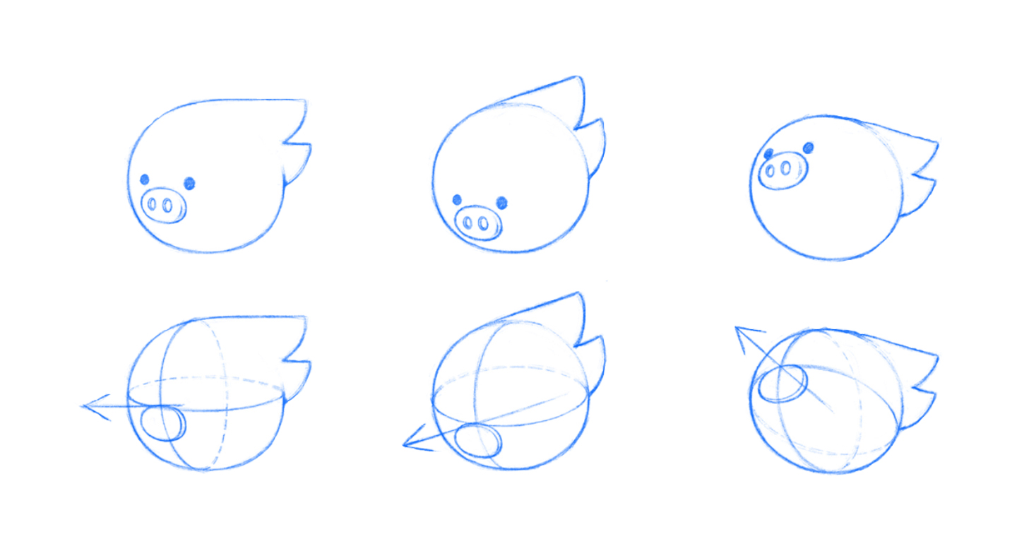 所以我们首先需要考虑的是怎样让人们的视觉重心放到飞猪心灵的窗户(眼睛)而不是之前那个巨大的鼻子上。我们试着在飞猪面部的中心区域对五官重新进行布置,将眼睛与鼻子的距离拉近,令它们处在面部1/2切线的位置上。同时把鼻子的造型按照猪鼻子的样子去“画”出来,我们会考虑它跟面部嵌入的衔接关系,在转到侧面的时候鼻子和鼻孔的形状看上去会发生的改变,通过透视关系把它的“厚度”表现出来。我们把这个过程叫做“面部的去logo导向”。