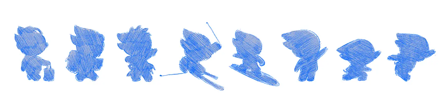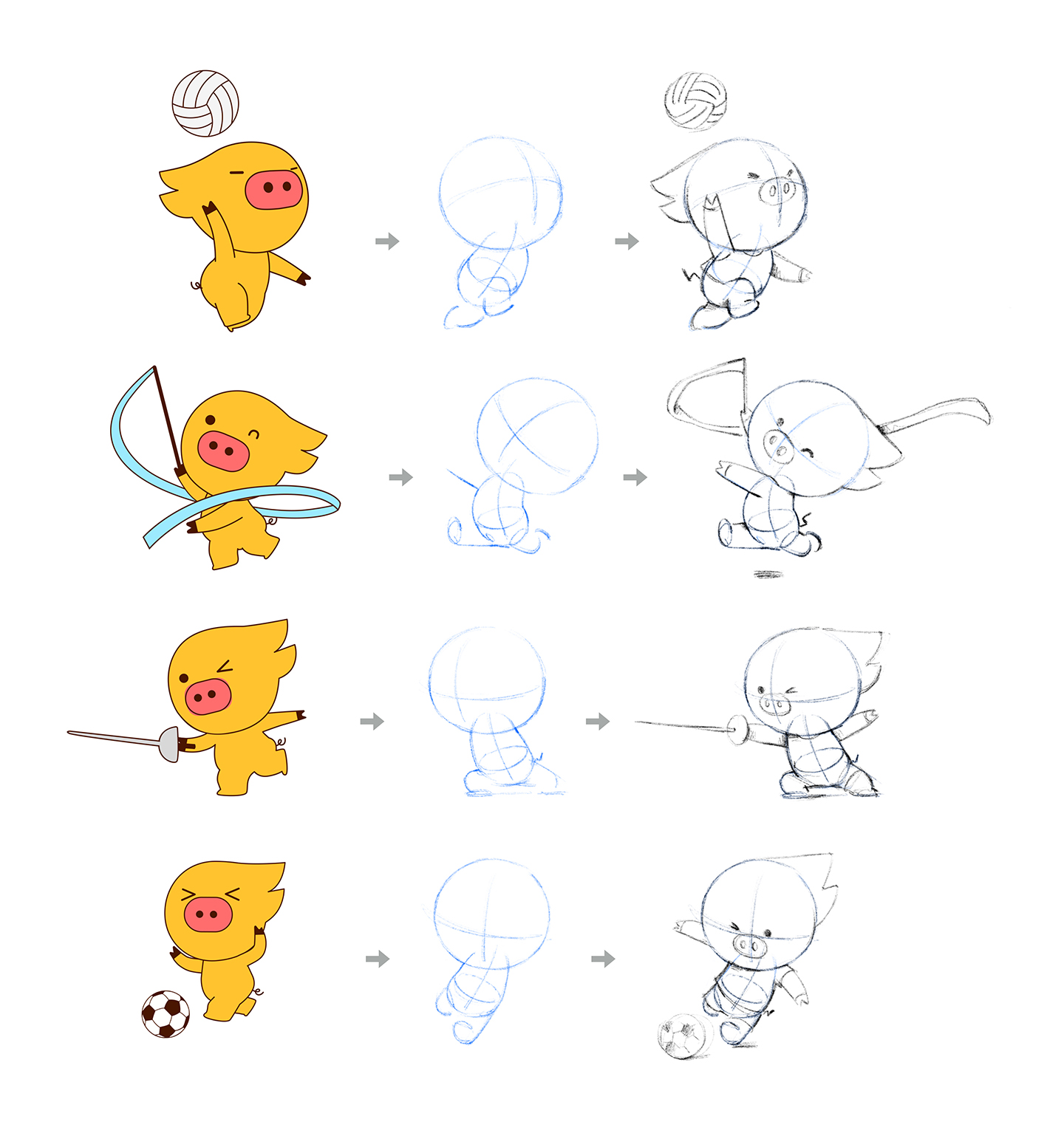 结构调整完成就可以开始拗造型试一下“表演”的效果了,以下面这组动态幅度比较大的奥运主题造型为例,用头部、躯干、四肢的结构把原始的动作重新组合一下,我们在每个动作当中都可以发现一条清晰的动态线,在完成这部的设定之后,再把形象的五官与肢体细节添加到结构上面,如果可以感受到形象的动态明确,完成稿剪影轮廓清晰,一组基于形体结构设计的具备表演性的主题动作才宣告完成。