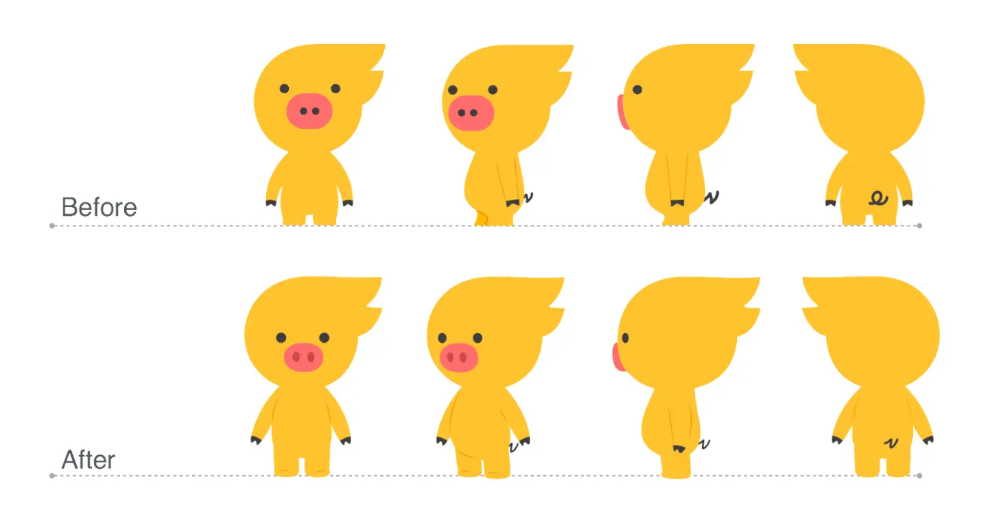 我们发现,之前小飞猪的形象总体是在logo的基础上加了一个矮胖的身体,并没有对他进行立体化的考量。因为过重的logo导向,使形象整体显得有些呆滞,他的“亲和力”与“表演性”也跟着受到了很大影响,在我们想把他当作一个IP去开发图档和周边产品的时候,会有很多场景都不太适用,甚至连一个45度的转角都没有办法用合理的方式来实现。