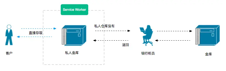 而Service Worker可以理解成,在客户端创建了一个属于自己的金库,先看图: