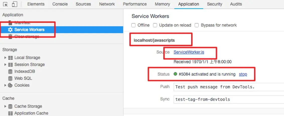 画红框的内容是一些比较关键的信息,比如其中表明了Service Worker的文件名和路径,以及当前Service Worker的状态,Service Worker的状态分为几种,STOPPED(已停止)、STARTING(正在启动)、RUNNING(正在运行)和STOPPING(正在停止),比如上面的截图就处于RUNNING状态。
