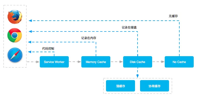 从整体上来说,应用获取一个资源的缓存类型分为上图中的四种,分别是Service Worker、Memory Cache、Disk Cache和No Cache。资源查找顺序为从左向右,找到资源则返回,未找到则继续寻找,直至最终获取资源。上面的图中可以清楚的看出Service Worker在缓存类型中的位置,也能看到跟平时经常提到的强缓存和协商缓存的关系。
