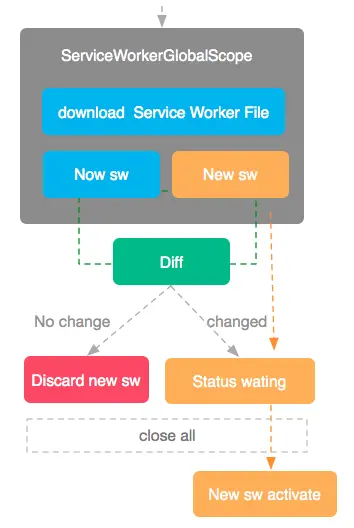 当应用加载时,会下载Service Worker文件,这是在浏览器中就会有两个文件,一个是当前正在使用的Service Worker,一个是新下载的Service Worker,当新下载的文件下载完毕后,浏览器会对两个文件进行Diff操作,如果发现文件没有更新,则会丢弃掉新下载的Service Worker文件,如果发现有变化,则会加载新的Service Worker,但新加载的Service Worker会处于wating状态,并不会实际发挥作用,只有当整个浏览器中对正在运行的Service Worker没有依赖时,才会将运行中的Service Worker抛弃,将新的Servier Worker置为激活状态。