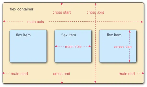 display:flex的元素。在demo中,它是<section>元素 - flex item:放置在flex container内的元素,图片中有main size和cross size描述它的大小。在demo中,它们是3个