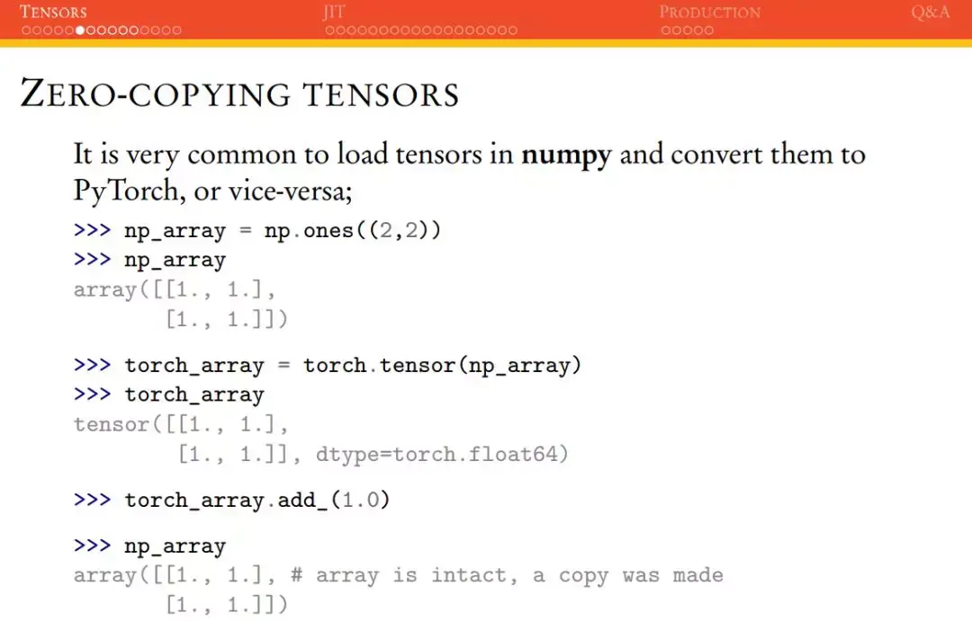 Zero-Copying 的形式确实能省很多内存,但是如上所示在位(in-place)和标准运算之间的区别会有点模糊。如果用 np_array = np_array +1.0,torch_array 的内存不会改变,但是如果用 np_array += 1.0,torch_array 的内存却又会改变。