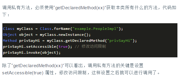 - 在反射中核心的方法是 newInstance() 获取类实例,getMethod(..) 获取方法,使用 invoke(..) 进行方法调用,通过 setAccessible 修改私有变量/方法的访问限制。