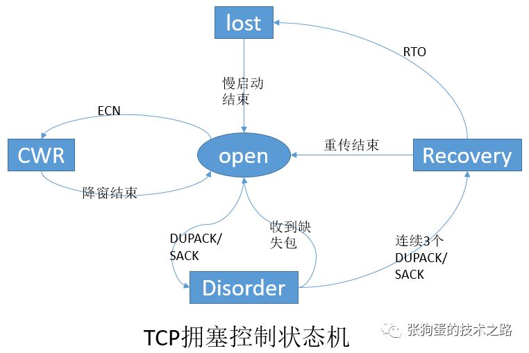 和TCP一样,拥塞控制算法也有其状态机。当发送方收到一个ACK时,Linux TCP通过状态机的状态来决定其接下来的行为,是应该降低拥塞窗口cwnd大小,或者保持cwnd不变,还是继续增加cwnd。如果处理不当,可能会导致丢包或者超时。