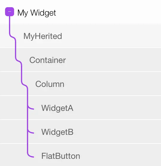 FlatButton触发MyWidget状态更新时,MyState的build方法回调,重新构建MyInherited对象传入新值,由于data发生变化,MyInherited的方法updateShouldNotify中返回了true,最终使得与MyInherited关联的WidgetA触发reBuild。