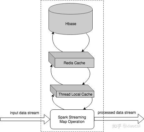 由于日志量巨大,为了不影响 Streaming 任务的处理速度,我们设计了两层缓存:Thread Local Cache 和 Redis Cache,同时用 HBase 做持久化存储以保存历史用户。
