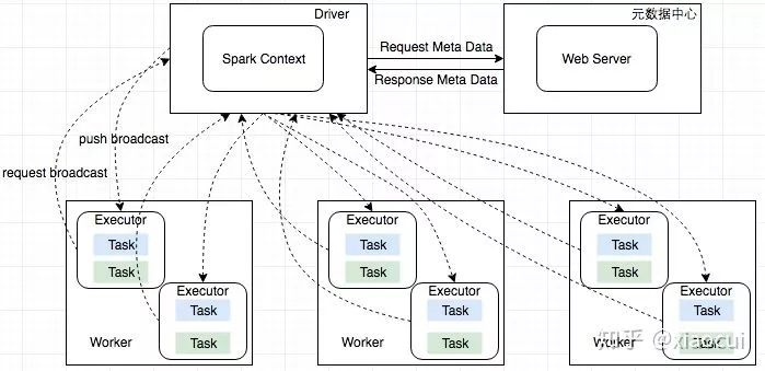 我们可以把经常变化的元数据作为 Streaming Broadcast 变量,该变量扮演的角色类似于只读缓存,同时针对该变量可设置 TTL,缓存过期后 Executor 节点会重新向 Driver 请求最新的变量。