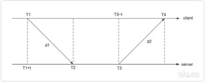 可以看出,t、d只与T2、T1差值及T3、T4差值相关,而与T2、T3差值无关,即最终的结果与服务器处理请求所需的时间无关。因此,客户端即可通过T1、T2、T3、T4计算出时差t去调整本地时钟。