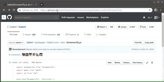 github.com替换为github.githistory.xyz,回车即可访问到代码变更的记录。也可以安装浏览器插件 Chrome 或 Firefox,在某个文件的网页上就能看到一个 `Open in Git History` 的按钮,点击即可。