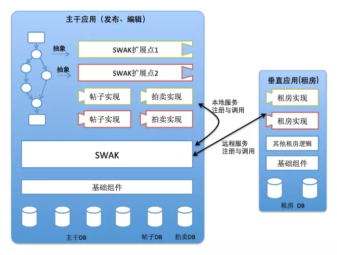 - 首先,我们把租房业务给单独抽取出来。原先的帖子和拍卖业务暂时没有独立的团队来予以维护(但也基本上没有什么新需求)因此暂时仍然放在主干应用中,时机合适将会和租房应用一样迁移出去。