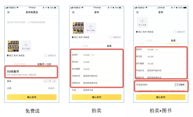 在闲鱼,各种业务所需要存储的东西大同小异,从闲鱼的发布界面上来看就不难发现这一点,都是在基础对象(如标题、描述、图片)之外添加一些业务相关的数据,如拍卖业务中指定拍卖的开拍时间等信息,免费送业务中设置兑换币值,图书业务上设置条形码。即对一本图书进行拍卖当然也是允许的,这就出现了拍卖业务和图书业务叠加起来的复合型业务。