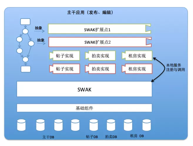 第一轮改造中,闲鱼将原先的商品发布和编辑功能从老应用中抽取到了新应用item。为了实现“平台和业务分离、业务和业务隔离”的目标,闲鱼自研了一套技术框架SWAK,具体请参考文章《业务代码解构利器--SWAK》,该文介绍了其设计思想和实现原理。接入SWAK框架后,平台逻辑和业务逻辑得到了分离,各个业务(如租房业务、免费送业务)之间的逻辑也不再耦合,而是变成package隔离(当然也是可以做成jar包隔离)。