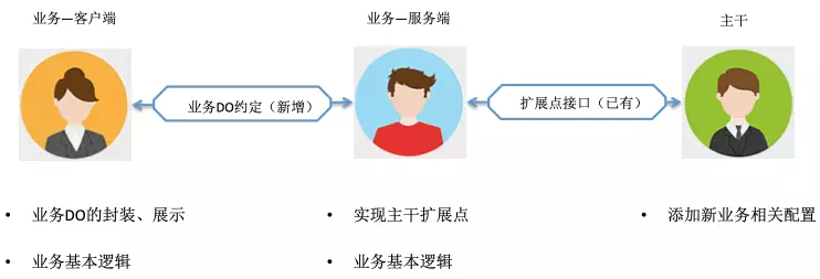 - 主干开发人员。主干的人员只需要维护主干的代码,尤其是扩展点的抽象。随着不同业务的不断接入,原先的扩展点也需要随之调整。