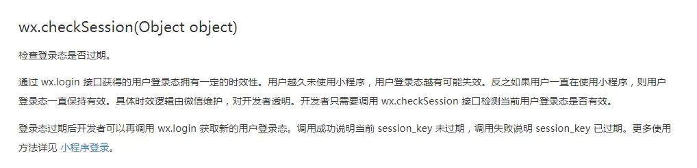 由于微信小程序的限制,我们无法得知用户的登录状态是否过期,所以我们必须要通过wx.checkSession 来接口检测当前用户登录态是否有效,做对应的逻辑处理~