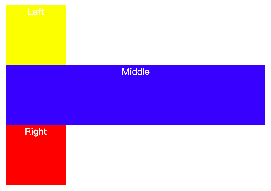 想象一下,你接到了一个任务,要求实现一个三列布局,无论左右两列的宽度怎么变化,中间列的宽度都要自适应,效果大概如下图(为了突出效果,给三列都添加了背景颜色):
