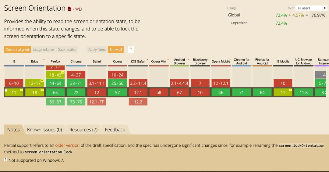 Screen Orientation API 通过在 Screen 接口上扩展属性 orientation 为我们提供该 API 的所有功能: