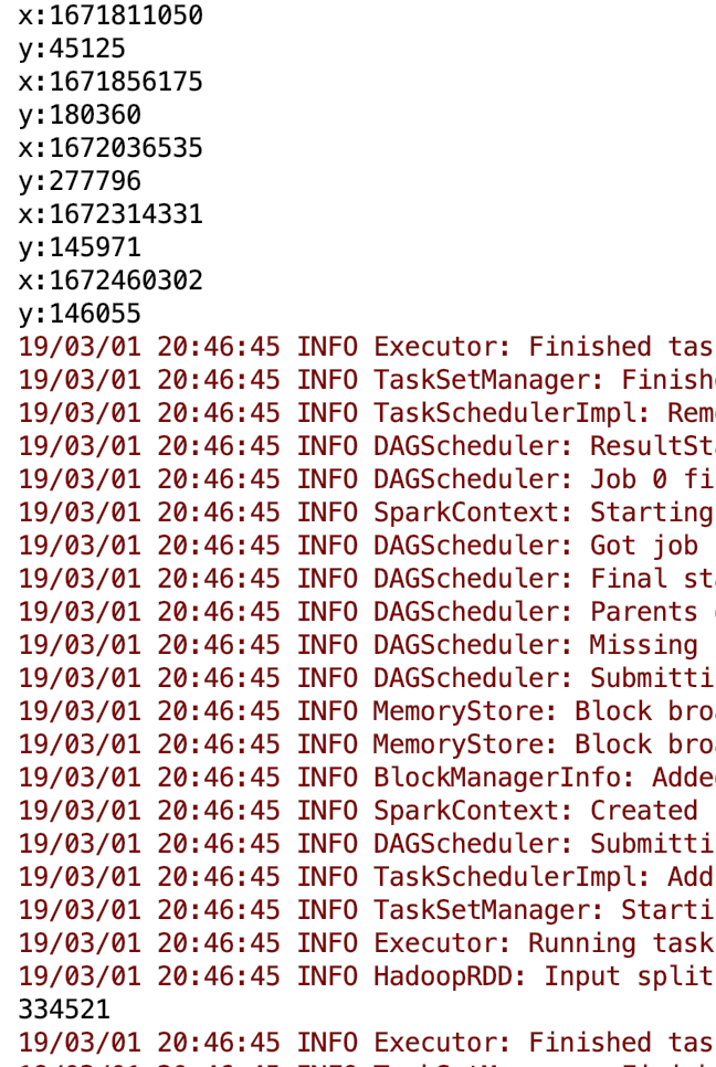 我们注意到三个程序输出的顺序不一样,但是本质的结果都是一致的。这里体现了spark的一个优点,由于是在单机本地上,该优点表现出来的是相同输入输出结果顺序不同。但是在集群中,该优点表现出来的是在集群中各自处理,而后返回结果。当数量足够大的时候,这个优点就更加明显。