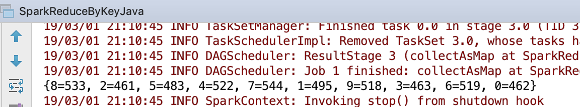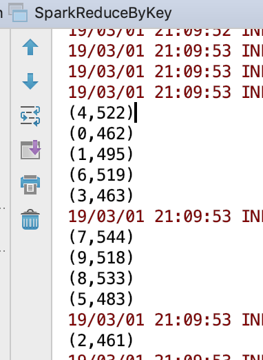 spark的reduceByKey对要处理的值进行了差别对待,只有key相同的才能进行reduceByKey,则也就要求了进行reduceByKey时,输入的数据必须满足有键有值。由于上述的avg我们是用随机数生成的,那么我们可以用reduceByKey完成一个其他功能,即统计随机数中末尾是0-9各个数值出现的个数。