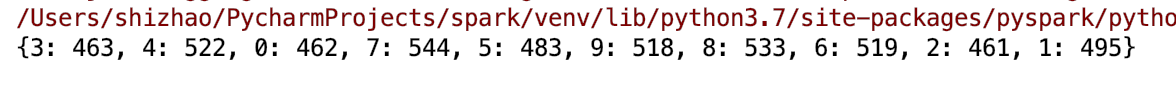 print(sc.textFile("./avg").map(lambda s:(int(s)%10,1)).reduceByKey(lambda x,y:x+y).collectAsMap())