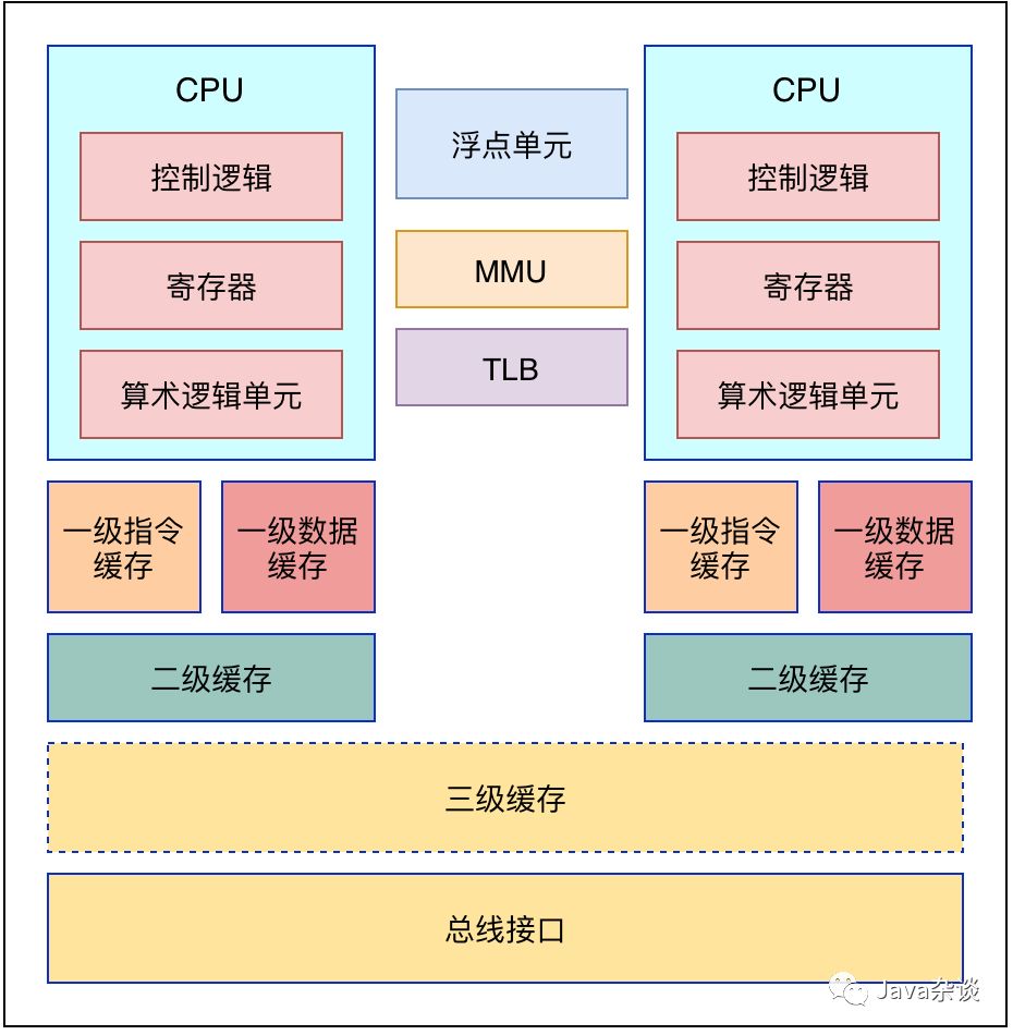 一个CPU里包含控制逻辑、寄存器、算术逻辑单元、一级Cache(又分为指令Cache和数据Cache)、二级Cache等。多个CPU单元共享浮点单元、MMU、TLB等。在某些处理器中可能还会有多个CPU共享的三级Cache。