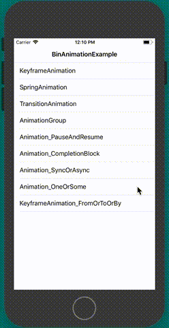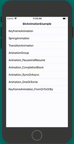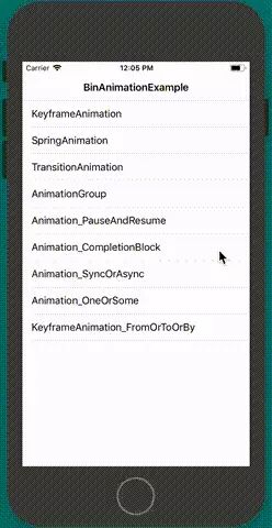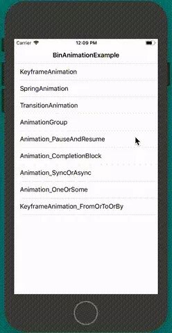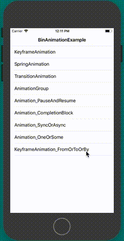// MultiAnimationcase 0:[self.animationlabel.layer bin_addAnimation_sync:^(BinAnimationFounder *founder) { founder.springAnimation.mass(1).stiffness(50).damping(2).initialVelocity(10).byValue([NSValue valueWithCGSize:CGSizeMake(0, 200)]); founder.toKeyframe.scaleX(0.2).scaleY(0.2).keyTime(1.0).autoreverses(YES);}];break;case 1:[self.animationlabel.layer bin_addAnimation_sync:^(BinAnimationFounder *founder) { founder.toKeyframe.translationY(200).keyTime(1.0).autoreverses(YES); [founder keyframeAnimation]; founder.toKeyframe.opacity(0.0).keyTime(1.0).autoreverses(YES);}];break;// AnimationGroupcase 0:[self.animationlabel.layer removeAllAnimations];[self.animationlabel.layer bin_addAnimation_sync:^(BinAnimationFounder *founder) { float settlingDuration = 0; founder.springAnimation.mass(1).stiffness(50).damping(2).initialVelocity(10).byValue([NSValue valueWithCGSize:CGSizeMake(0, 200)]).getSettlingDuration(&settlingDuration); founder.toKeyframe.scaleX(0.2).scaleY(0.2).keyTime(settlingDuration); founder.animationGroup.duration(settlingDuration + 1.0).repeatCount(100);}];break;case 1:[self.animationlabel.layer removeAllAnimations];[self.animationlabel.layer bin_addAnimation_sync:^(BinAnimationFounder *founder) { founder.toKeyframe.translationY(200).keyTime(1.0); [founder keyframeAnimation]; founder.toKeyframe.opacity(0.0).keyTime(1.0).autoreverses(YES); founder.animationGroup.duration(2.0).repeatCount(100);}];break;
