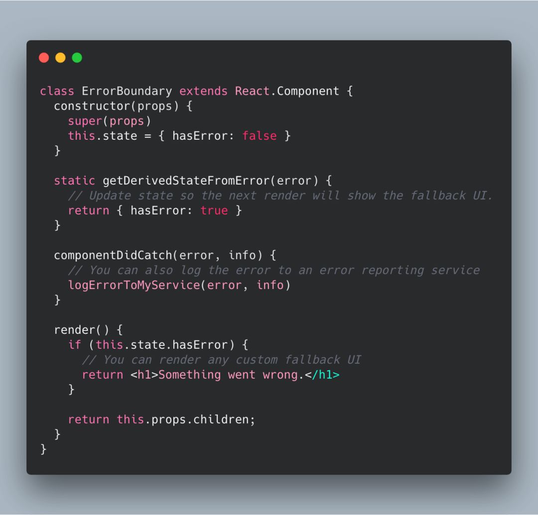 总而言之,ErrorBoundary 组件可以做到 write once, run anywhere,这里不讲述太多关于 ErrorBoundary 的东西,直接上代码,首先,创建一个 ErrorBoundary 组件: