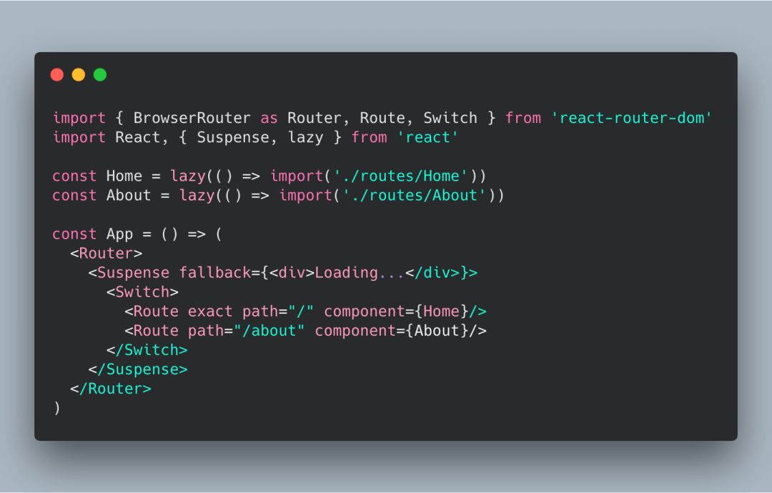 截止目前我们知道了如何借助这两个新特性实现组件的懒加载。现在要更进一步 —— 基于路由的 code splitting,话不多说,直接上代码: