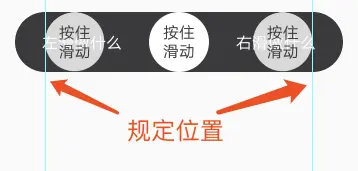 这里规定的位置如上图,这个位置距离黑色背景边界的长度刚好等于按钮的半径。当往左边滑动时,手指抬起的时候,如果圆心的X坐标大于2倍的按钮的半径即直径的话,就回到初始位置,否则滑动到左边,往右边滑动时的判断同理。具体的代码如下