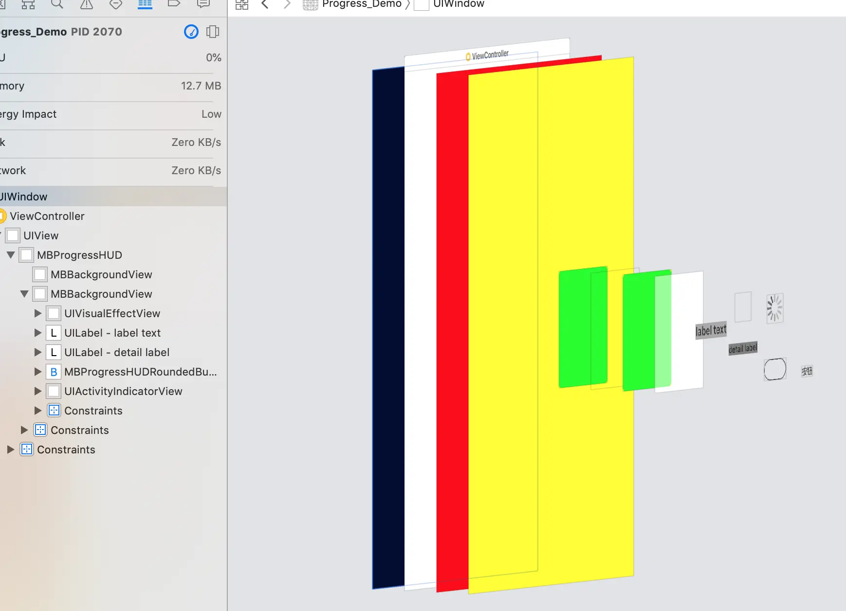 通过层级图配合代码来看MBProgressHUD的UI布局:为了方便查看:笔者将不同的view设置了不同的颜色。