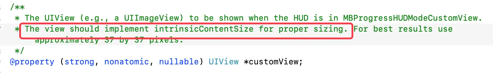 在这里要提醒注意的是:如果要设置mode为MBProgressHUDModeCustomView,就是你不想用第三方提供的一些指示器视图,想自己自定的话,你自定义的view必须实现intrinsicContentSize方法,获得一个合适的大小。因为作者的布局是通过约束,不是利用frame的,作者在方法的注释里也说明了,该自定义视图需要实现intrinsicContentSize固有大小的方法来获得一个合适的尺寸。系统中的UILabel、UIButton和UIImageView都默认已经实现了intrinsicContentSize这个方法,如果你的自定义view就直接是继承于UIView类的话,那么需要实现这个intrinsicContentSize方法。
