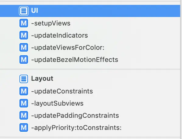 setupViews方法是添加一些背景视图、label等一些固定的不会变化的视图;而updateIndicators是单独来布局指示器视图的,也是该库功能的核心体现视图。对外提供了设置hud的mode的接口,所以,这个指示器视图就会有很多种情况,作者单独将其拿出来。作者通过约束进行视图布局。