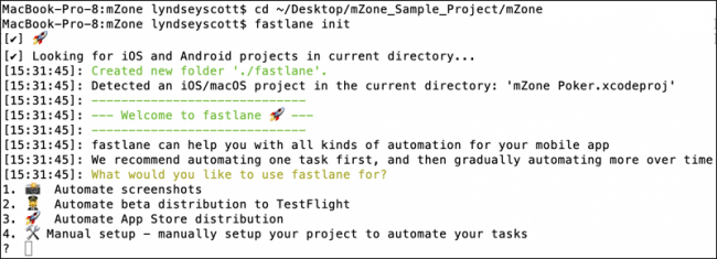 虽然fastlane recommend[s] automating one task first,但在本单一教程中您将实施多项自动操作,因此输入4以开始手动设置。 读取输出并在出现提示时按Enter键。