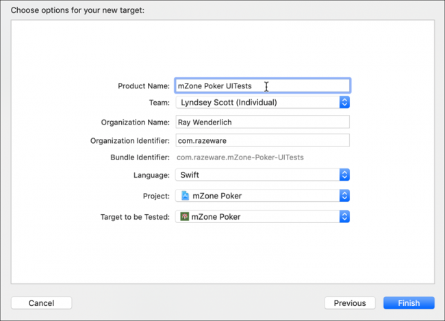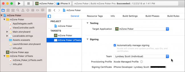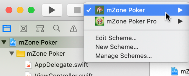 在mZone_Sample_Project中看到Multiple_Targets文件夹? 在Xcode中打开Multiple_Targets / mZone-2 / mZone Poker.xcodeproj。 除了两个新目标之外,这个项目应该看起来很像第一个:mZone Poker Pro和mZone Poker Pro UITest。