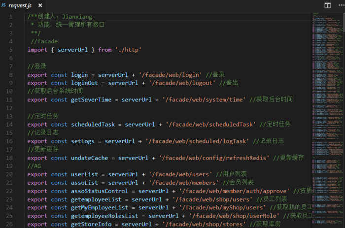 对于请求接口的管理,我觉得也有必要提一下。因为我有一次在接一个项目的时候,发现所有请求的api统统硬编码写在了请求方法里。这真的是写时一时爽,修改找半天,费了九牛二虎之力才完成了工作。 目前,我对请求接口的管理呢,是将所有接口都放到了一个统一的文件中。在调用相关接口的时候,直接从这个request.js文件中获取,这样做的好处首先就是避免了硬编码这种很让人忌讳的方式,同时在一个接口多出调用时,只需要引入一下就可以获取到,再者就是维护起来特别的方便。