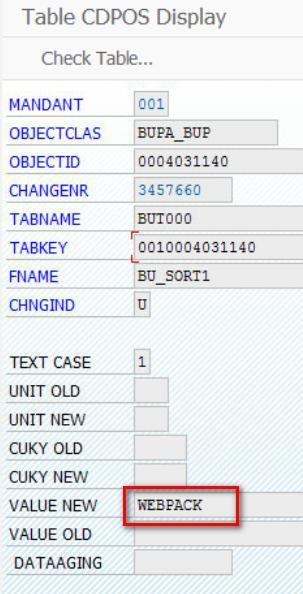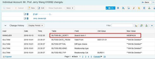 SAP CRM和C4C的客户主数据修改历史记录查询 已注销 2019-03-02 248 阅读1分钟 SAP CRM 随便修改一个字段,比如给Search Term维护值“webpack”: Change History assignment block里显示出了这条修改记录: 根据时间在change history的抬头表CDHDR里找到这条对应的记录: 具体修改明细在表CDPOS里: SAP C4C 如果把客户的某个字段比如地址里的house number从5改成510: 在Feed标签页里能看到修改日志: 要获取更多Jerry的原创文章,请关注公众号"汪子熙":