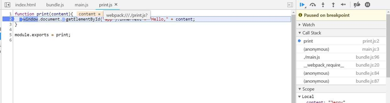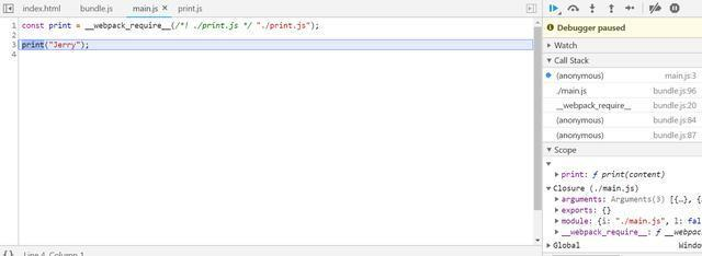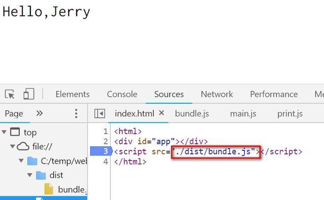 那么运行时,Hello,Jerry的字符串是如何通过bundle.js打印出来的呢?