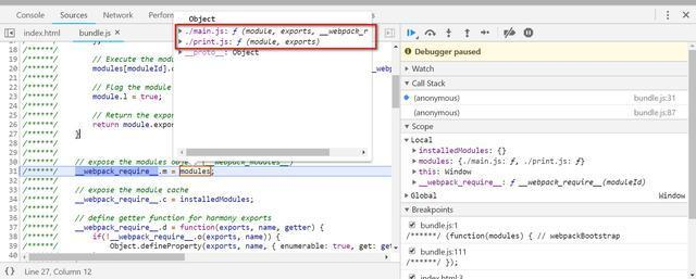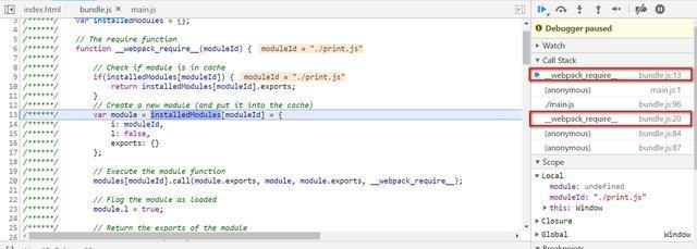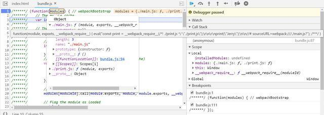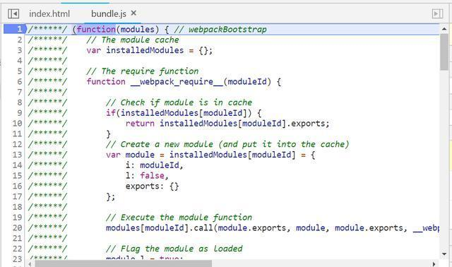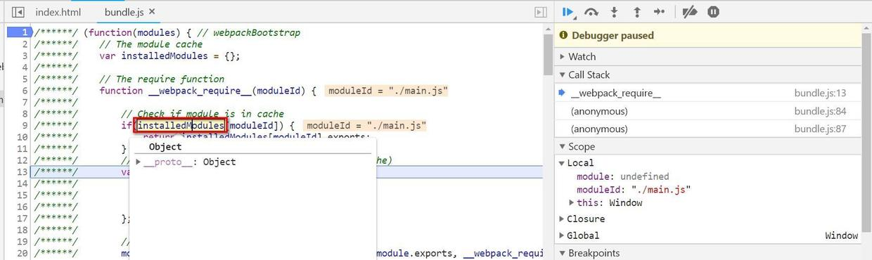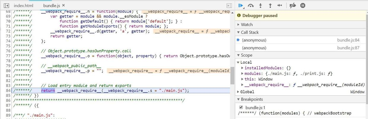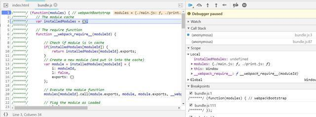 这就是本文要阐述的内容。我们可以从bundle.js第一行设置断点,然后开始调试: