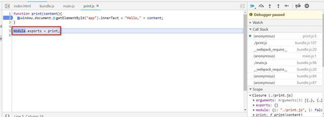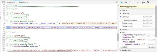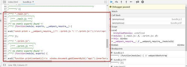 然后执行这个module的函数,即我们实现在main.js里的javascript代码。当然经过webpack的加工,main.js里的代码已经通过eval的方式嵌入到bundle.js里了。